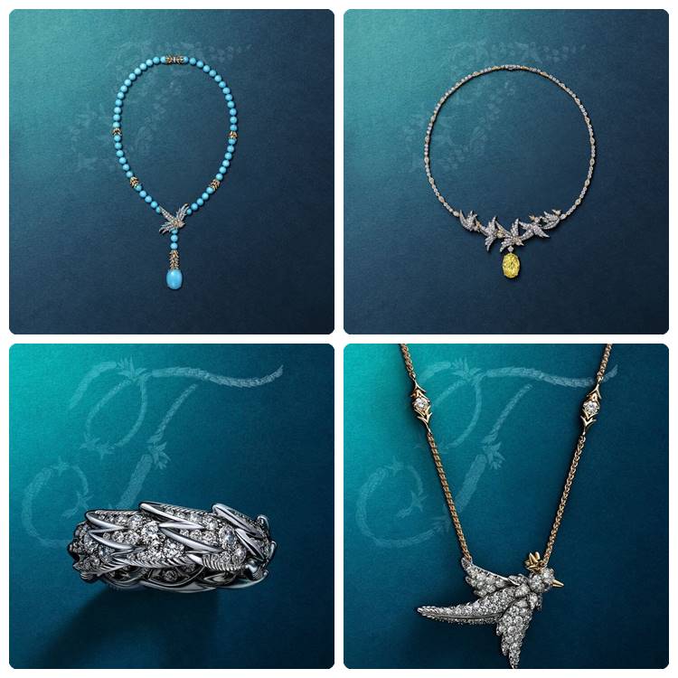 La colección Bird on a Rock reinterpreta el icónico broche de Jean Schlumberger con conjuntos de alta joyería y una nueva línea de joyería fina. La colección de joyería fina presenta dos aspectos diferentes: uno figurativo y otro abstracto. Las aves figurativas, elaboradas en platino y oro de 18 quilates con vibrantes piedras preciosas, parecen revolotear delicadamente y posarse sobre quien las lleva. El detalle abstracto «Wings» captura la esencia del vuelo con formas esculpidas y simbólicas que encarnan el movimiento elegante y las complejas capas que se encuentran en el plumaje de los pájaros. Las dos nuevas colecciones de alta joyería rinden homenaje a la rica herencia de piedras preciosas de Tiffany & Co., una basada en la tanzanita y otra en la turquesa.